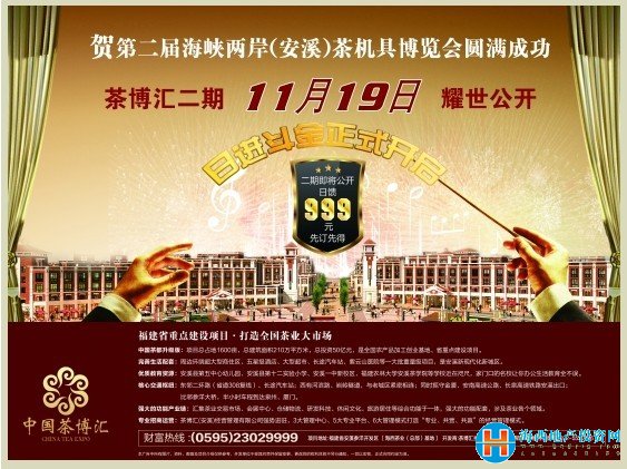 位于安溪的中國茶博匯,項目總占地1600畝,總建筑面積210萬平米,總投資50億元,是福建省重點建設項目,正鼎力打造全國最大茶葉市場,其二期將在11月19日公開,日進斗金正式開啟,日饋999元,先訂先得。有意向的房友可致電詳詢。