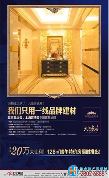 (海西地產投資網6月20日報道)大江盛世項目將于端午節(6月23日)推出端午特價房,面積為128平,最高優惠20萬。據悉,該項目只用一線品牌建材,品牌為北京奧運會、上海世博會專屬建材品牌。
