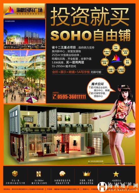 (海西地產(chǎn)網(wǎng)9月27日報道)海峽國際廣場項目為省十二五重點項目,政府鼎力支持,而其SOHO自由鋪,55-2950平魔術(shù)空間,5.8米挑高,買一層用兩層,會所+展示+商鋪+5A寫字樓,無限可能。