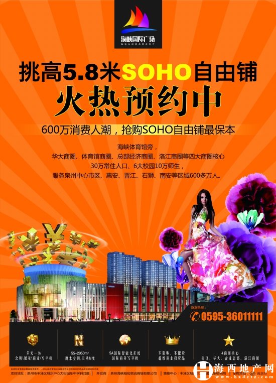 泉州海峽國(guó)際廣場(chǎng),福建省十二五重點(diǎn)項(xiàng)目、泉州市重點(diǎn)建設(shè)項(xiàng)目,由豐澤區(qū)政府、福建省箱包原輔材料行業(yè)協(xié)會(huì)和泉州市包袋同業(yè)商會(huì)強(qiáng)強(qiáng)聯(lián)合開(kāi)發(fā)。項(xiàng)目規(guī)劃占地總面積200畝,總建筑面積約25萬(wàn)平方米,位于城東海峽體育中心商圈、洛江高尚居住商圈、華大商圈、總部經(jīng)濟(jì)商圈等四大商圈核心位置,東臨福廈高速公路,南臨泉州海峽體育中心城東大道,西臨324國(guó)道,北臨福廈高速公路入口處,項(xiàng)目同時(shí)規(guī)劃公交站點(diǎn)、4號(hào)輕軌站及的士站點(diǎn),四通八達(dá),交通非常便利。1分鐘可到達(dá)高速路口,5分鐘達(dá)到泉州火車站、泉州汽車站,10分鐘到達(dá)臺(tái)商投資區(qū),半小時(shí)輻射惠安、石獅、晉江等地,服務(wù)600萬(wàn)人口。項(xiàng)目以采用國(guó)際先進(jìn)規(guī)劃及運(yùn)營(yíng)理念,規(guī)劃一環(huán)、三軸、五大廣場(chǎng)、十大主題,并率先在泉州實(shí)現(xiàn)商場(chǎng)E化,打造泉州首席E-MALL概念商場(chǎng),提升泉州購(gòu)物環(huán)境,創(chuàng)領(lǐng)泉州商業(yè)新紀(jì)元,F(xiàn)主力推出SOHO自由鋪,店鋪、寫(xiě)字樓、商務(wù)會(huì)所、商業(yè)展銷中心多元一體,50—2950㎡魔術(shù)空間,5.8米層高,用一層的價(jià)格得兩層的使用,是投資者不容錯(cuò)過(guò)的首選之地!