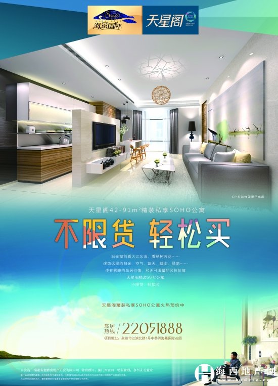 (海西地產網6月6日報道)海景國際天星閣,42-91㎡精裝私享SOHO公寓,不限貸,輕松買,火熱預約中!站在窗前看大江東流,看綠樹芳花……迷戀這里的陽光、空氣、藍天、碧水、綠蔭……還有稀缺的島居價值,和無可限量的區位價值!