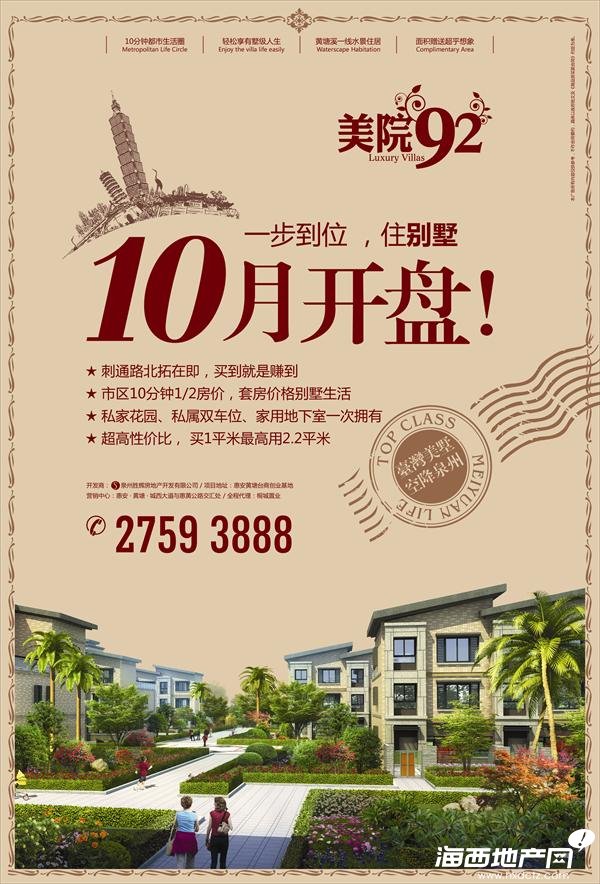 海西地產(chǎn)網(wǎng)9月4日消息:一灣美墅,空降泉州!美院92別墅10月即將開盤!刺桐北路北拓在即,買到就是賺到!到達市區(qū)僅10分鐘,1/2的套房價格享受別墅一般的生活;私密花園、私屬雙車位、家用地下室一次擁有;超高性價比,買1平方米最高用2.2平方!你還在等什么?!