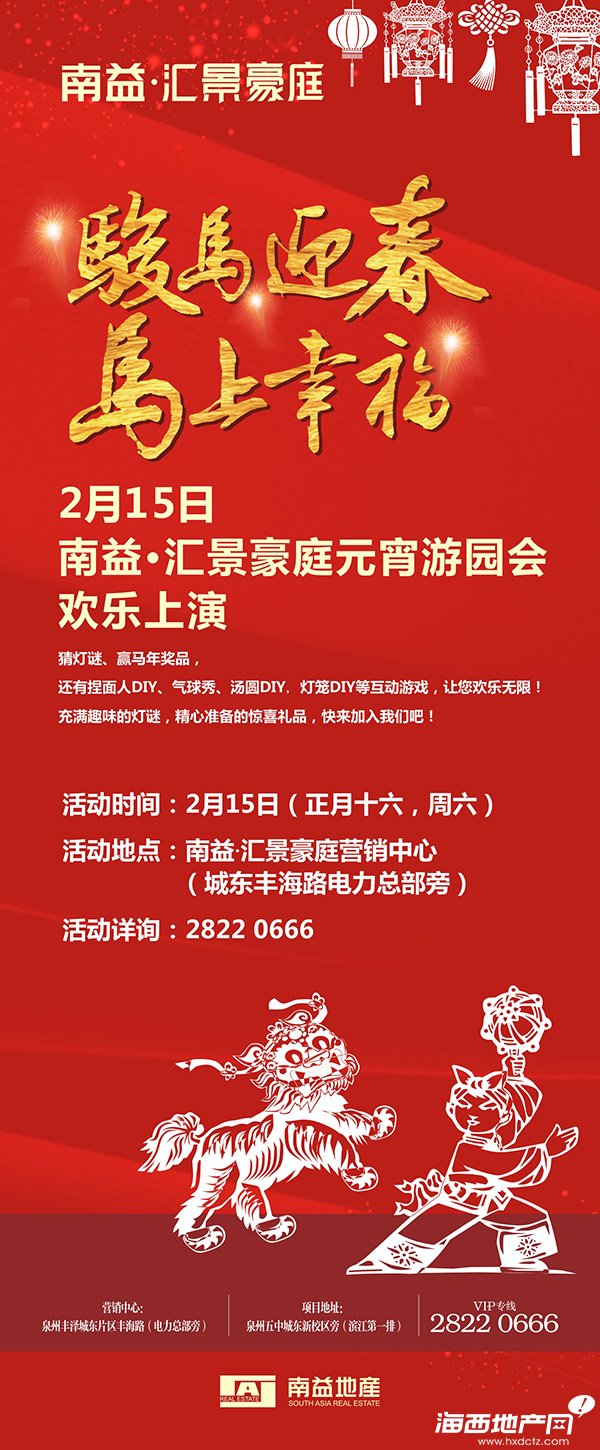 走街串巷觀燈展,齊聚一堂鬧元宵。為慶祝元宵佳節的到來,同時回饋廣大客戶的長期支持,2月15日,南益匯景豪庭誠邀八方來客歡歌笑語鬧元宵!燈猜謎題贏馬年禮品、栩栩如生的捏面人DIY、民間瑰寶的燈籠剪紙DIY、逗趣的氣球秀、美味湯圓DIY,各種精彩的趣味活動,讓你有得玩又有得獎!
