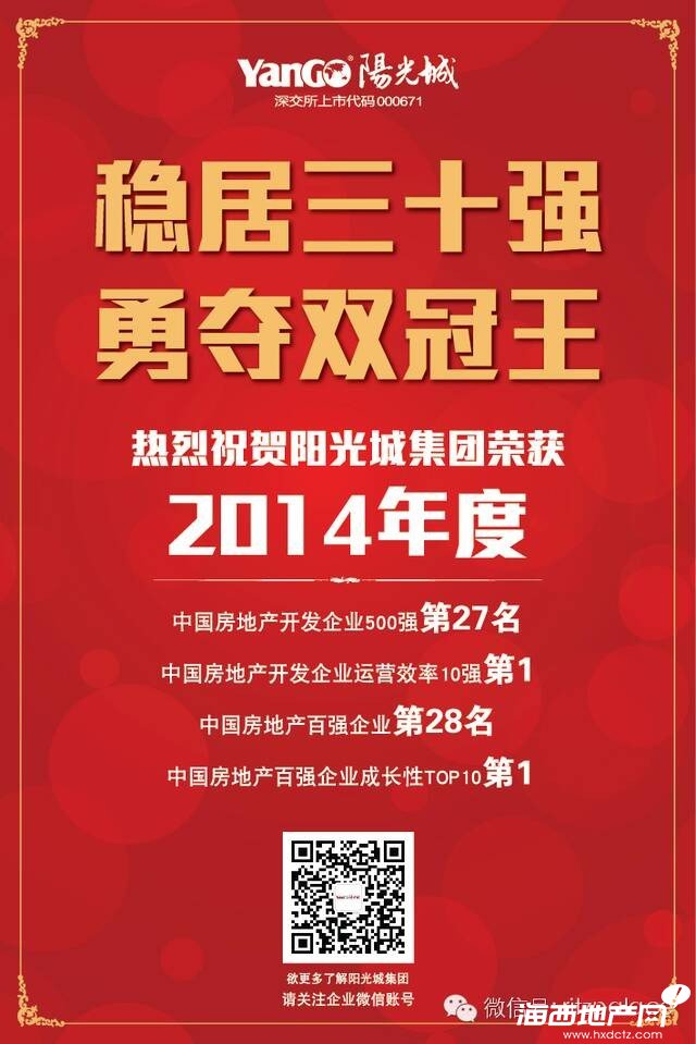 而在上周3月19日,陽光城剛剛入選“2014中國房地產開發(fā)企業(yè)500強” 第27,并獲得“運營效率10強”單項冠軍。