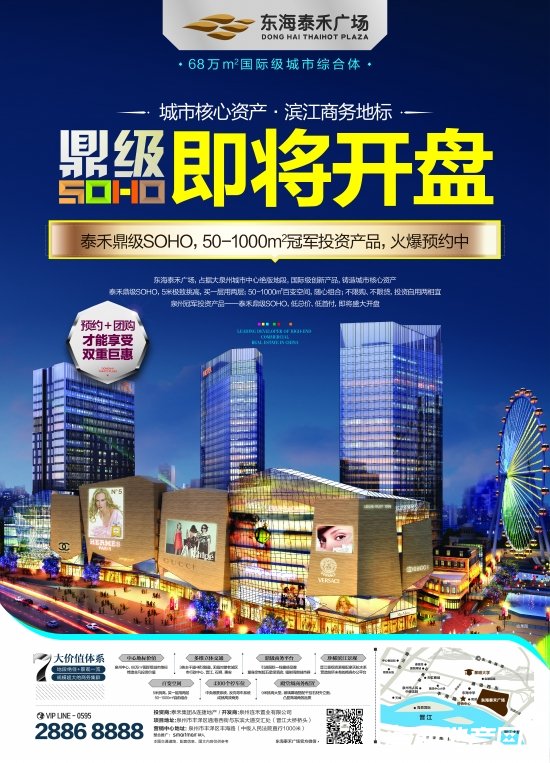 東海泰禾廣場總建筑面積68萬㎡,包括泰禾雙MALL、泰禾新天地、摩天輪游樂廣場、頂級商務(wù)集群、泰禾首璽五大核心板塊,囊括國際奢侈品購物中心、大型時尚精品購物中心、國際風(fēng)情商業(yè)街區(qū)、1萬㎡摩天輪游樂廣場、超五星級酒店、5A甲級寫字樓、頂級SOHO辦公、濱水典范華宅等八大業(yè)態(tài),具有三商業(yè)中心、一站式生活、多維城市空間互動、高端商業(yè)步行街區(qū)、城市地標(biāo)建筑以及更具人性化的規(guī)劃等六大特征,集購物、餐飲、娛樂、辦公、休閑、酒店、會議等于一體,聚合全球優(yōu)質(zhì)資源,強大的商圈輻射能級,將顛覆泉州現(xiàn)有商業(yè)格局,成為城市新名片,改變?nèi)荩綇B門。