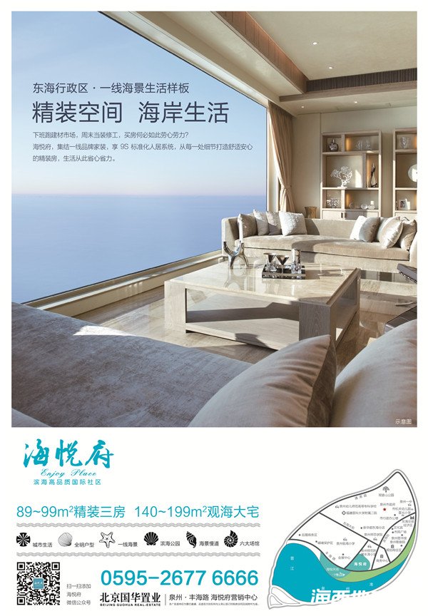 海悅府,泉州首席一線海景生活樣板。地處豐澤區東海版塊海岸線,臨近新市府,周邊配套一應俱全,區域發展潛力無限。項目用地3萬㎡,總建筑面積10萬㎡,沿海岸線精心規劃5棟高層建筑及20套濱海別墅。建筑排布上強調各棟建筑的景觀面與朝向,實現層層有景、戶戶觀海的效果。以簡約、大方的現代主義風格建筑錯落有致地勾勒出生動的濱海城市天際線。項目高層產品規劃有89—99㎡精裝海景三房,140—199㎡觀海府邸,大開間、短進深,戶戶全明、空間通透,奢享一線海景視野,締造泉州前所未有的國際濱海生活。