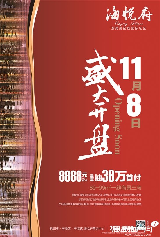 海西地產網訊 海悅府11月8日盛大開盤,絕版抄底價8888元/㎡起,最高抽38萬首付,最火熱的購房機會,錯過不再有!開盤聚劃算,更有大驚喜!據悉,89-99㎡海景三房還未發售,已受到全城眾多置業者青睞,這個問題,也并非無因可循。