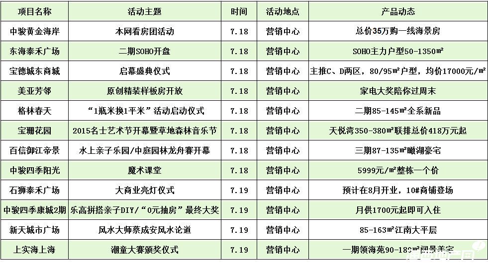 據本網不完全統計,本周將會有12個活動。其中,7月18日活動頗多。東海泰禾廣場二期SOHO(50-1350㎡)開盤【詳情】,一線瞰江,分期首付,免息半年;寶德·城東商城舉行更名啟幕盛典儀式【詳情】,精彩不容錯過;美亞芳鄰原創精裝樣板房盛情開放【詳情】,家電大獎陪你過周末;格林春天展開“1瓶米換1平米”活動啟動儀式【詳情】,優惠力度前所未有噢~;寶珊花園舉辦2015名士藝術節開幕儀式暨草地森林音樂節【詳情】,想high?還等什么;百信御江帝景水上親子樂園/中庭園林龍舟賽也將隆重開幕【詳情】,“龍虎之斗”即將上演;中駿四季陽光魔術課堂也將開課【詳情】,快帶上家里的小朋友一飽眼福吧!