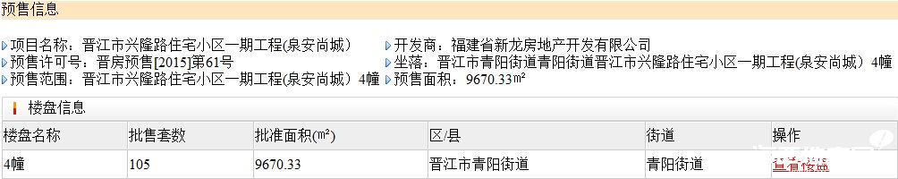 位于晉江青陽街道的興隆路住宅小區一期工程(泉安尚城)的4#房源獲批預售證,預售證號為晉房預售[2015]第61號,共計房源105套,其中,包括13間沿街店面與92套住宅,獲批面積9670.33㎡。