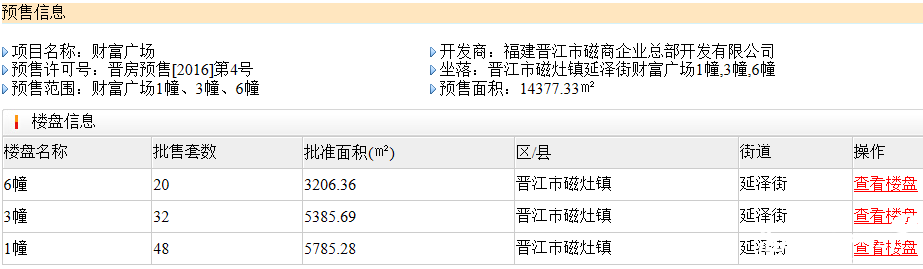 晉江磁灶財(cái)富廣場(chǎng)首期于1月22日獲批預(yù)售許可證,預(yù)售證號(hào)為晉房預(yù)售[2016]第4號(hào),獲批房源為1#樓、3#樓與6#樓,共計(jì)100套,獲批面積14377.33㎡。其中,1#樓獲批48套,3#樓獲批32套,6#樓獲批20套。