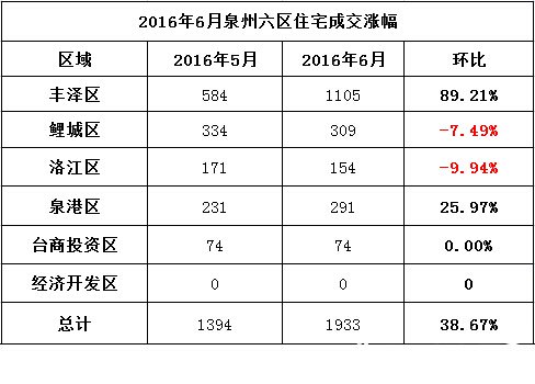 與5月份成交相比,豐澤區成交量基本翻一番,環比上漲89.21%;鯉城區與洛江區成交量均下跌,其中,洛江區環比下跌9.94%,鯉城區環比下跌7.49%;泉港區環比上漲25.97%;臺商投資區成交量與5月持平。