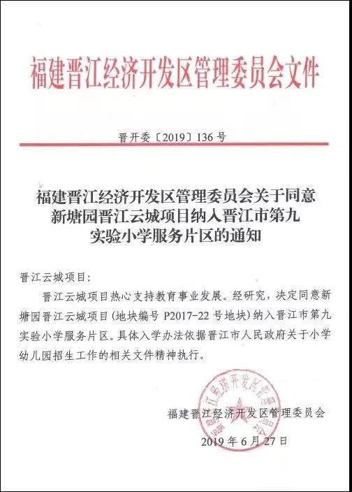 在教育上,片區的晉江市第九實驗小學(規劃中),總用地面積約24006平方米,規劃建設約42個教學班,計劃容納學生人數約1890人,建成后將服務片區教育,目前晉江云城已經正式劃入晉江第九實驗小學(規劃中)服務片區。同時項目還規劃約5000㎡社區幼兒園,未來可實現目送式陪伴送學。(注:后期招生方案以當地主管部門出臺的政策為準)