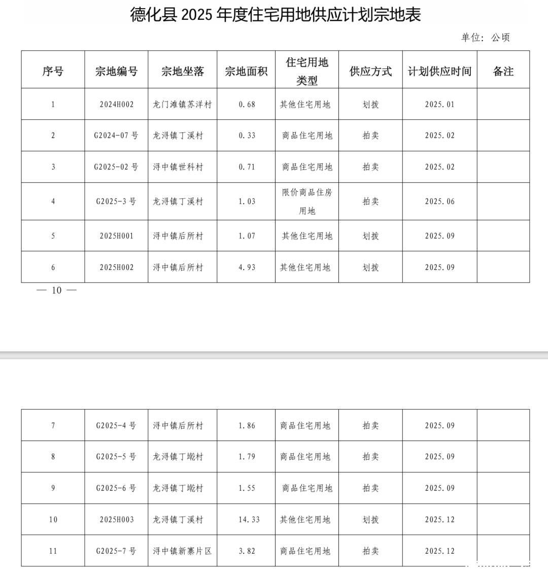 2025年度德化計劃供應11宗住宅用地,其中商品住宅用地6宗,其他住宅用地4宗及限價商品住房用地1宗。商品住宅用地方面,主要有龍潯鎮丁溪村的G2024-07號地塊,龍潯鎮丁墘村的G2025-5號、G2025-6號地塊,潯中鎮世科村的G2025-02號地塊,潯中鎮新寨片區的G2025-7號地塊,潯中鎮后所村的G2025-4號地塊。其他住宅用地則有分布在龍門灘鎮蘇洋村的2024H002號地塊,潯中鎮后所村的2025H001號、2025H002號地塊,龍潯鎮丁溪村的2025H003號地塊。