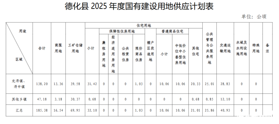 在布局方面,德化縣 2025 年度國有建設用地供應總量中,位于龍潯鎮、潯中鎮范圍內國有建設用地供應量為 138.20 公頃,占 74.55%;其他鄉鎮國有建設用地供應量為47.18公頃,占25.45%。