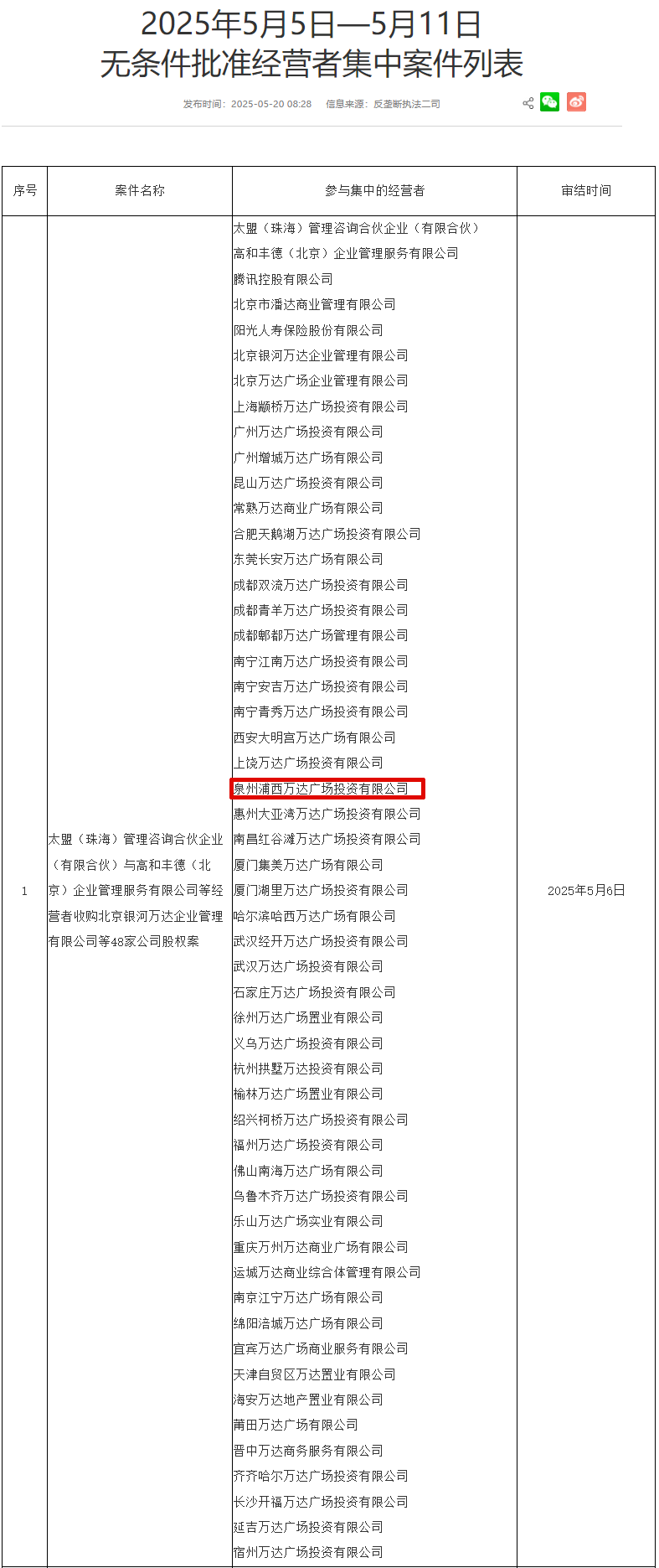 據國家市場監管總局近日披露的信息,太盟投資集團、騰訊控股、陽光人壽、京東關聯企業等組成的聯合體,通過新設基金完成收購大連萬達商業管理集團股份有限公司直接或間接持有的48家目標公司的100%股權。
