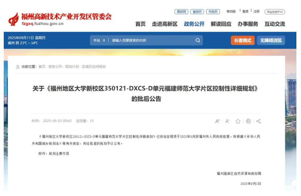 2025年9月3日,福州高新區自然資源和規劃局發布“關于《福州地區大學新校區350121-DXCS-D單元福建師范大學片區控制性詳細規劃》的批后公告 ”。