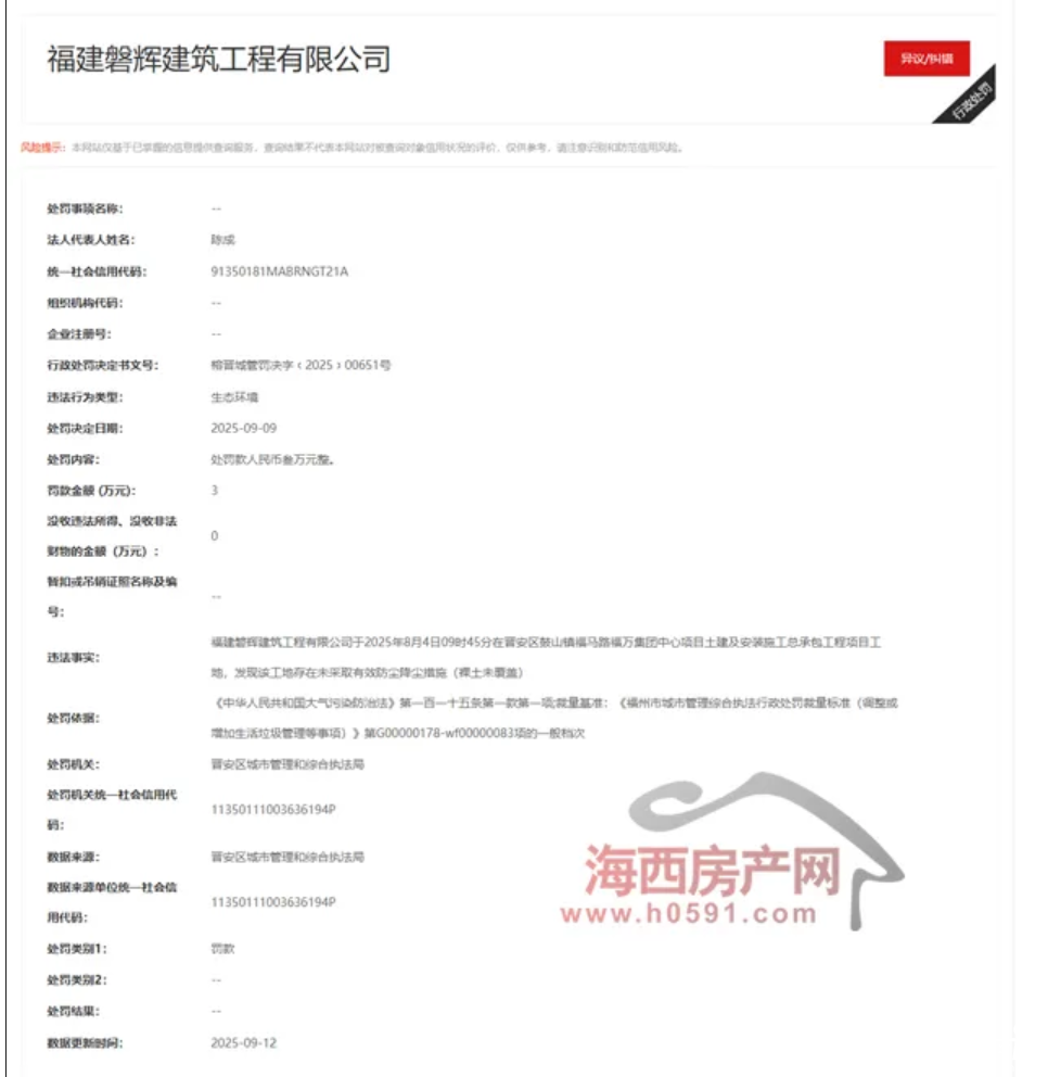 該處罰信息顯示,福建磐輝建筑工程有限公司于2025年8月4日09時(shí)45分在晉安區(qū)鼓山鎮(zhèn)福馬路福萬(wàn)集團(tuán)中心項(xiàng)目土建及安裝施工總承包工程項(xiàng)目工地,發(fā)現(xiàn)該工地存在未采取有效防塵降塵措施(裸土未覆蓋)。