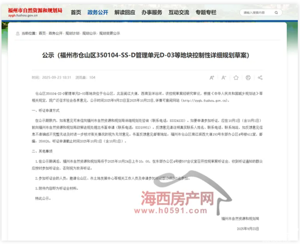 9月23日, 福州市自然資源和規劃局發布“福州市倉山區350104-SS-D管理單元D-03等地塊控制性詳細規劃草案公示”。
