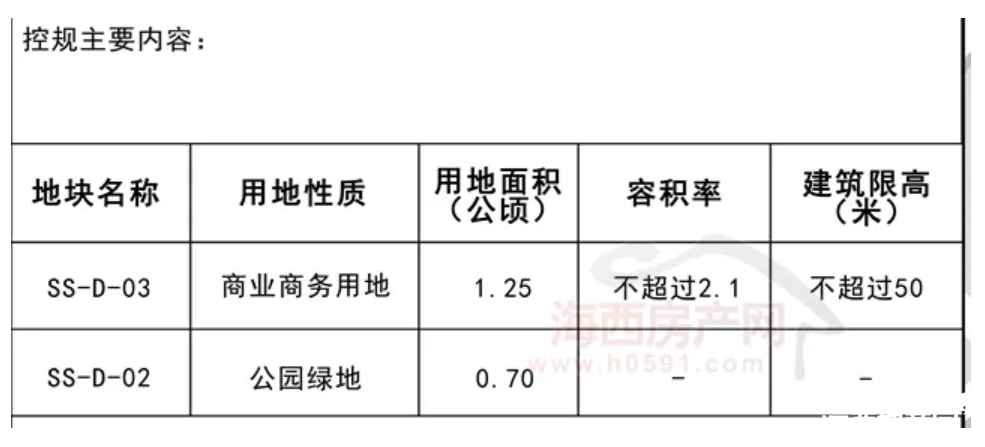 倉山區350104-SS-D管理單元D-03地塊用地性質為商業商務用地,用地面積1.25公頃(18.75畝),容積率不超過2.1,建筑限高不超過50米。