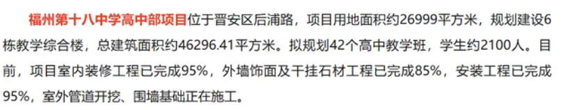 據(jù)透露,福州第十八中學高中部項目室內(nèi)裝修工程已完成95%,外墻飾面及干掛石材工程已完成85%,安裝工程已完成95%,室外管道開挖、圍墻基礎正在施工。
