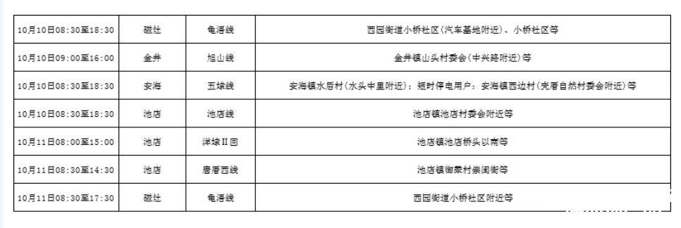 因客戶工程、配改工程、市政工程、低壓工程需要,擬對(duì)下列線路進(jìn)行電力檢修,請(qǐng)檢修范圍內(nèi)各用電客戶做好準(zhǔn)備。若遇下雨等特殊原因,可能取消相應(yīng)區(qū)域檢修。實(shí)際送電時(shí)間以現(xiàn)場(chǎng)施工進(jìn)度為準(zhǔn)。給您造成不便,敬請(qǐng)諒解,感謝您的支持!