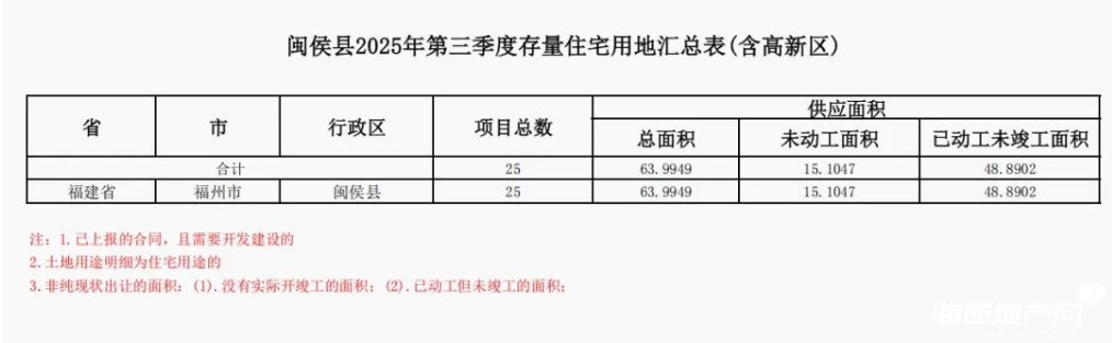 閩侯縣2025年第三季度存量住宅用地匯總表(含高新區)顯示,項目共有25個,總面積63.9949公頃(折合959.92畝),未動工面積15.1047公頃,已勸工未竣工面積48.8902公頃。